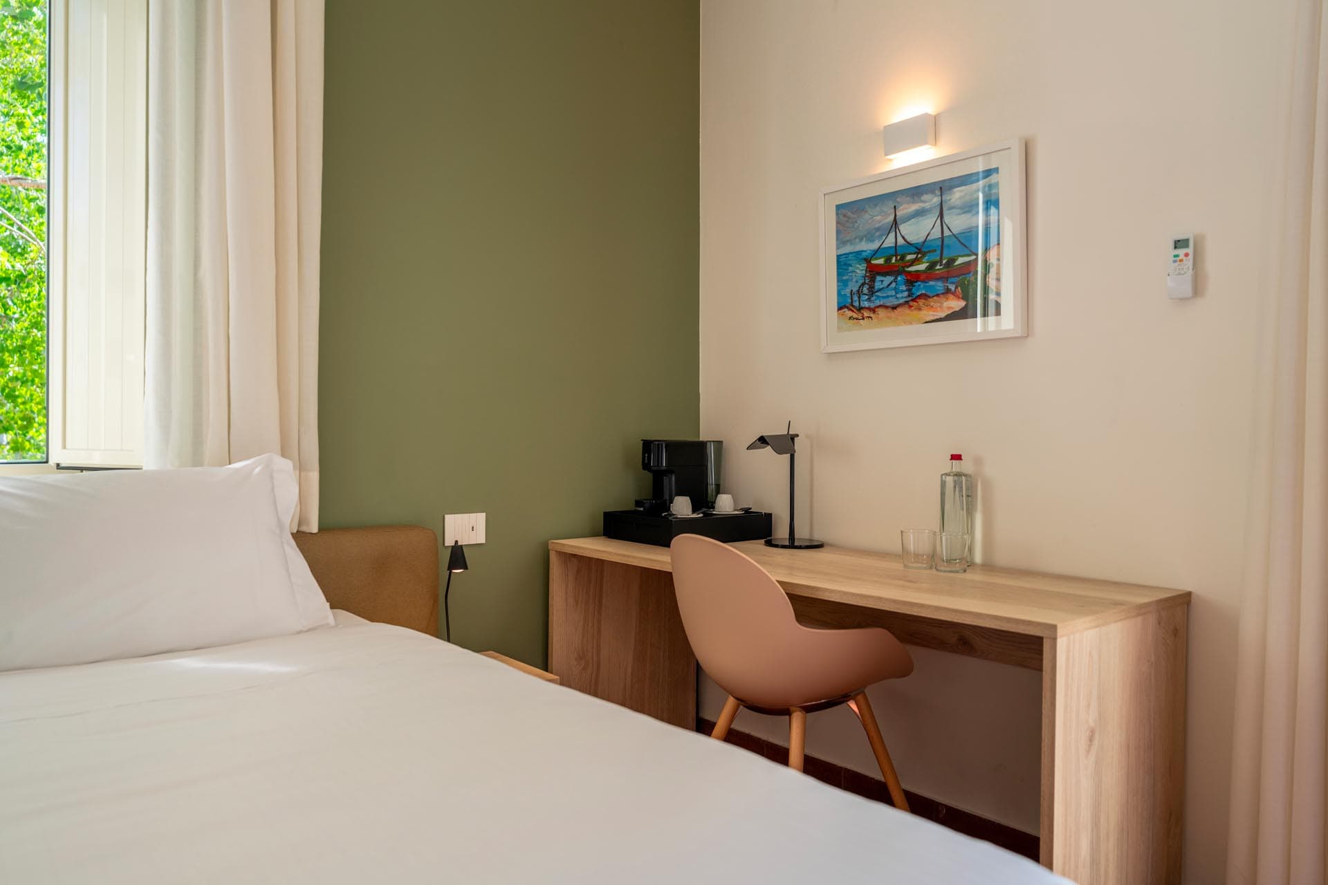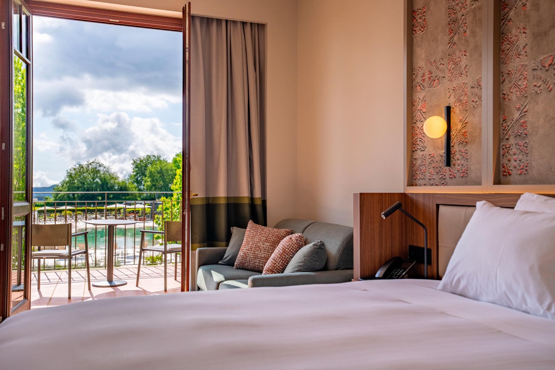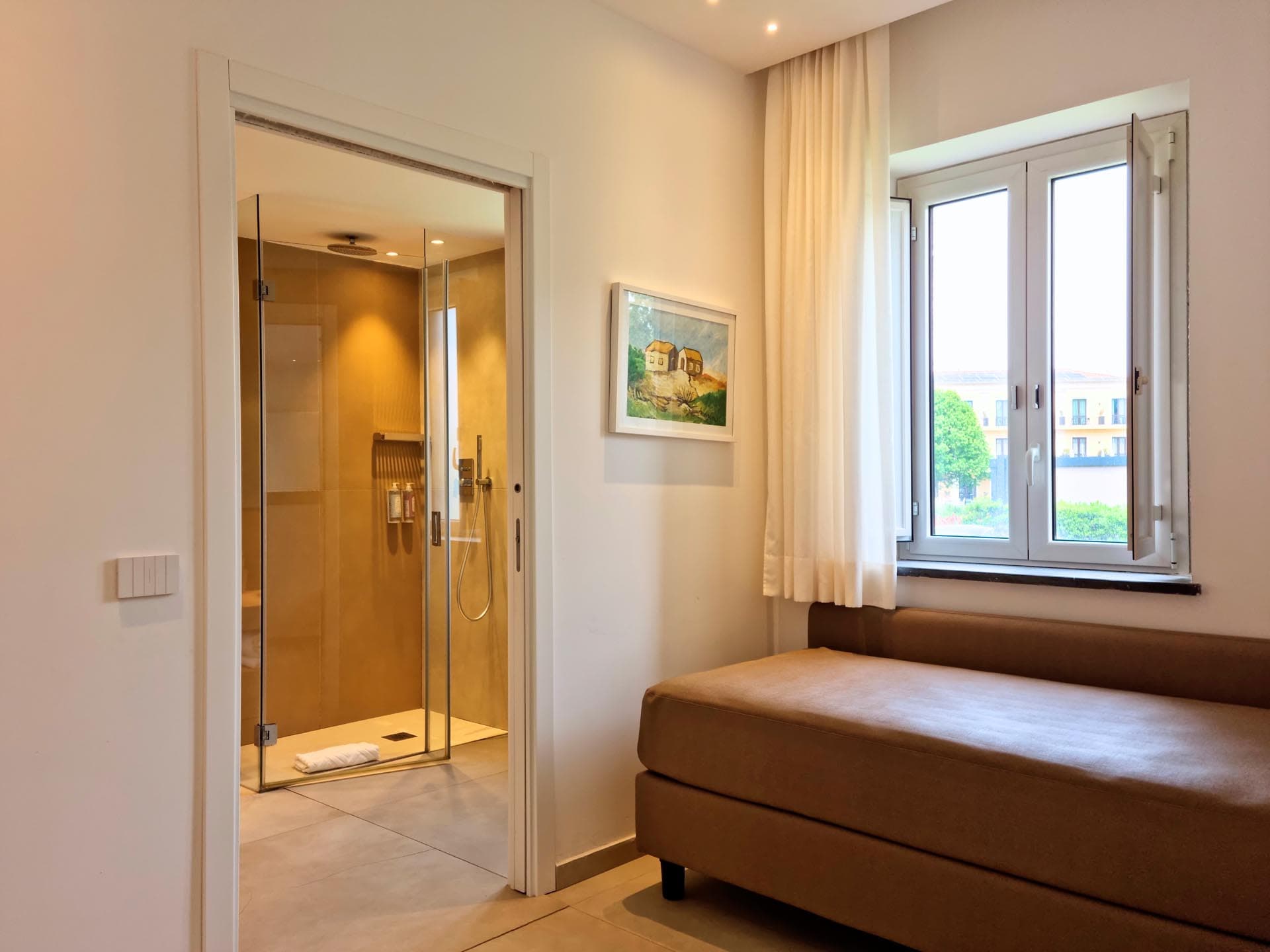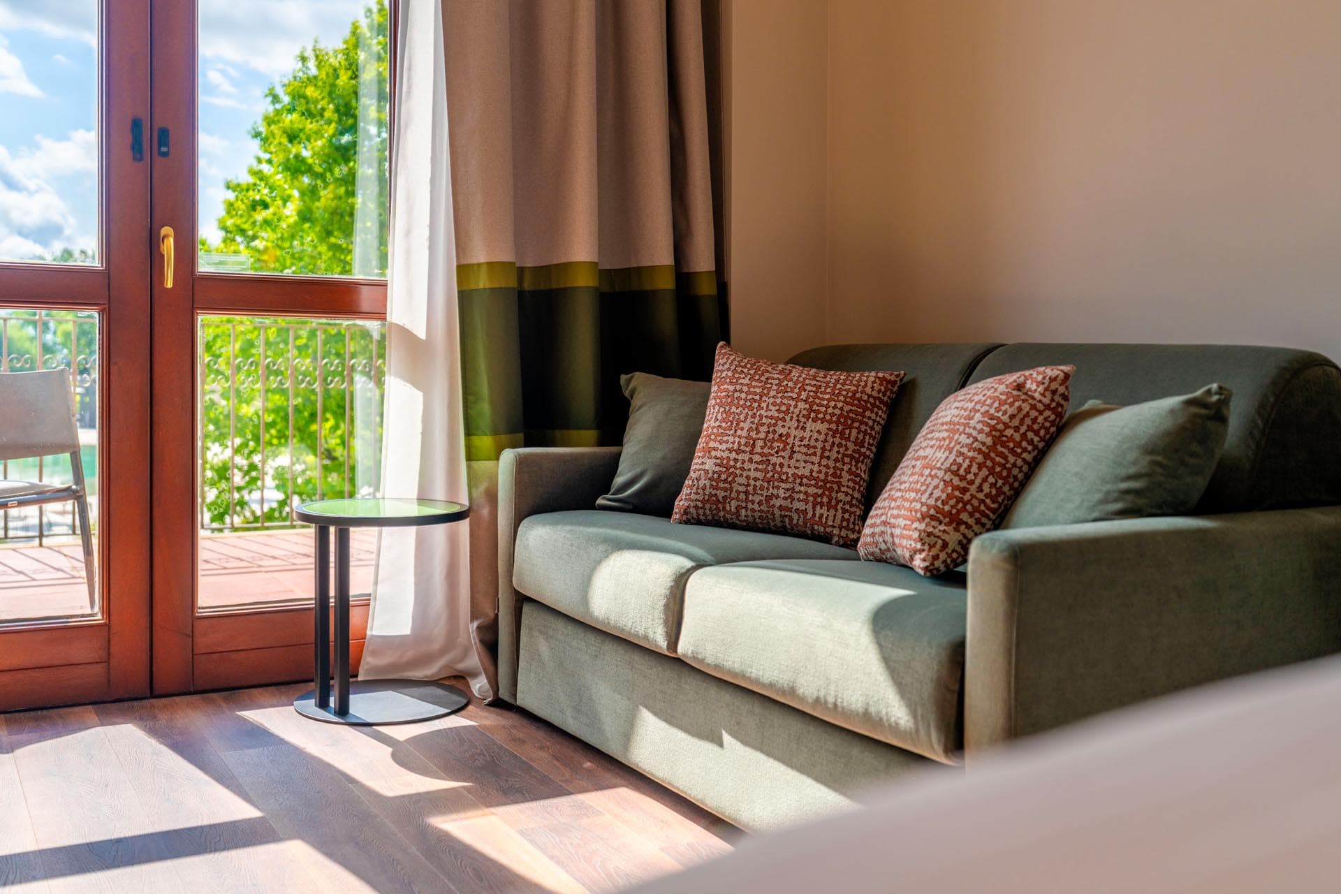 This elegant and spacious Deluxe room has two twin beds and a sofa bed Start your day right with a cup of tea or coffee on your private balcony, or cosy up to watch a movie on the HD TV. This room has a walk-in shower with a rainfall showerhead in the bathroom.