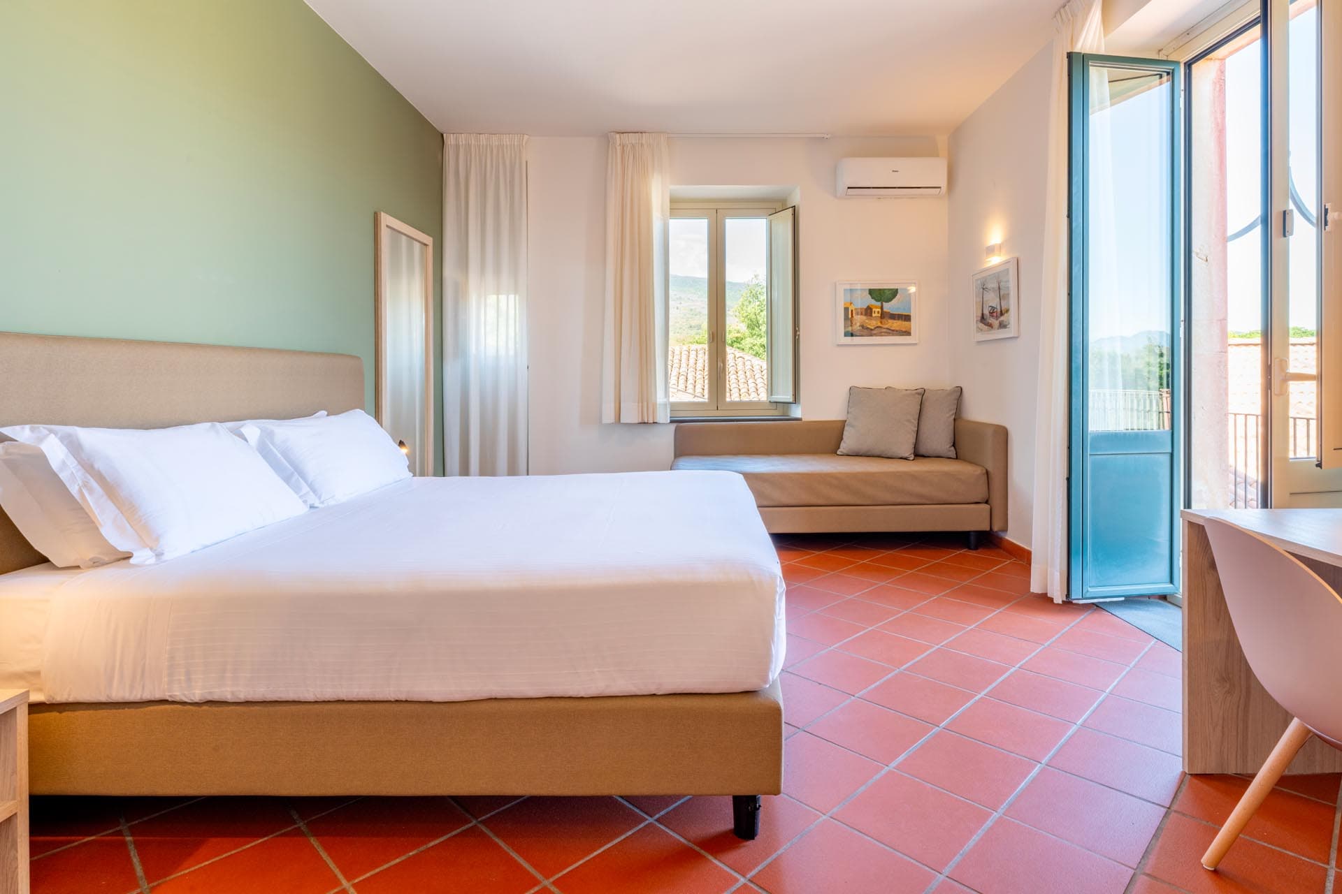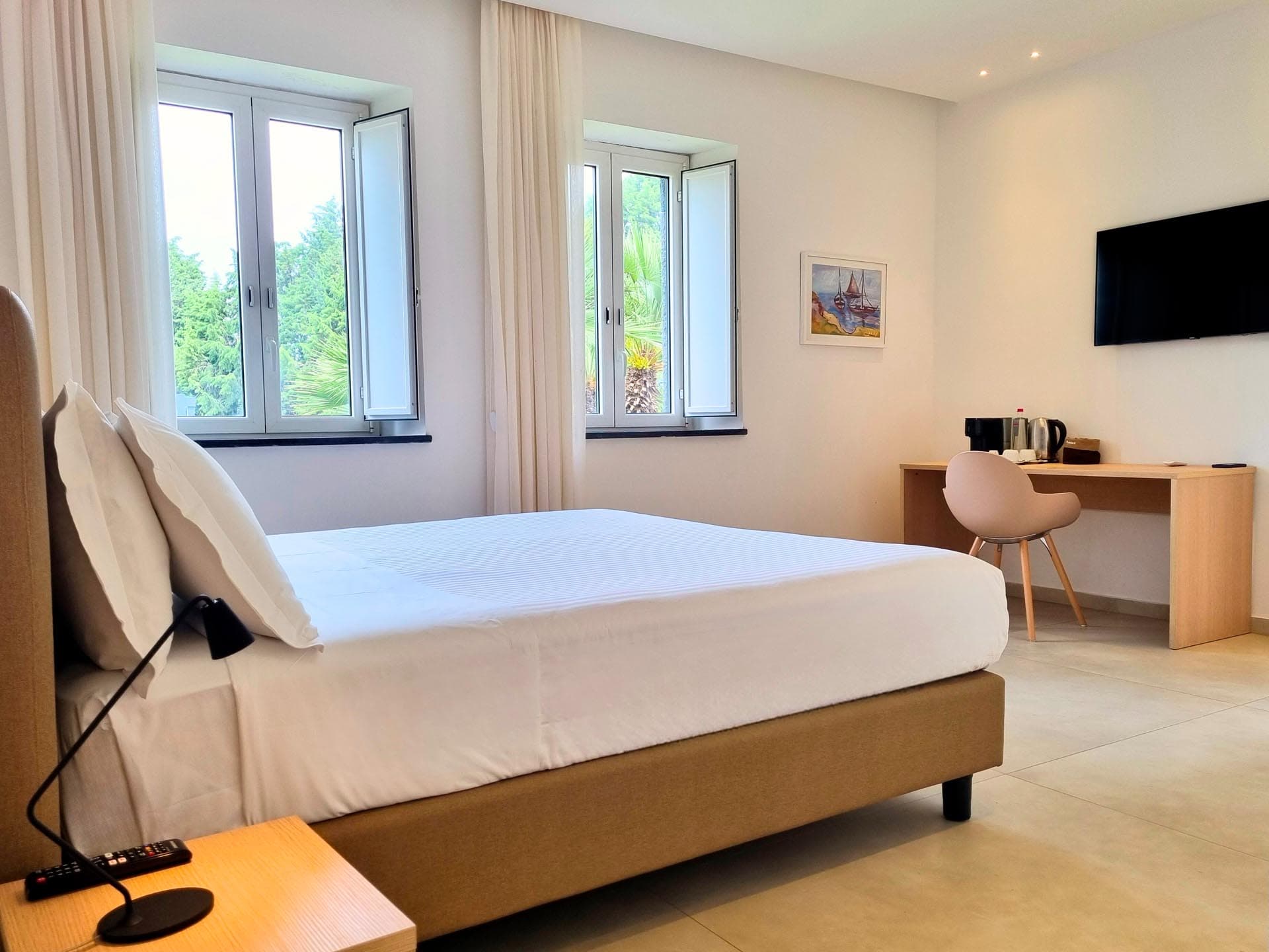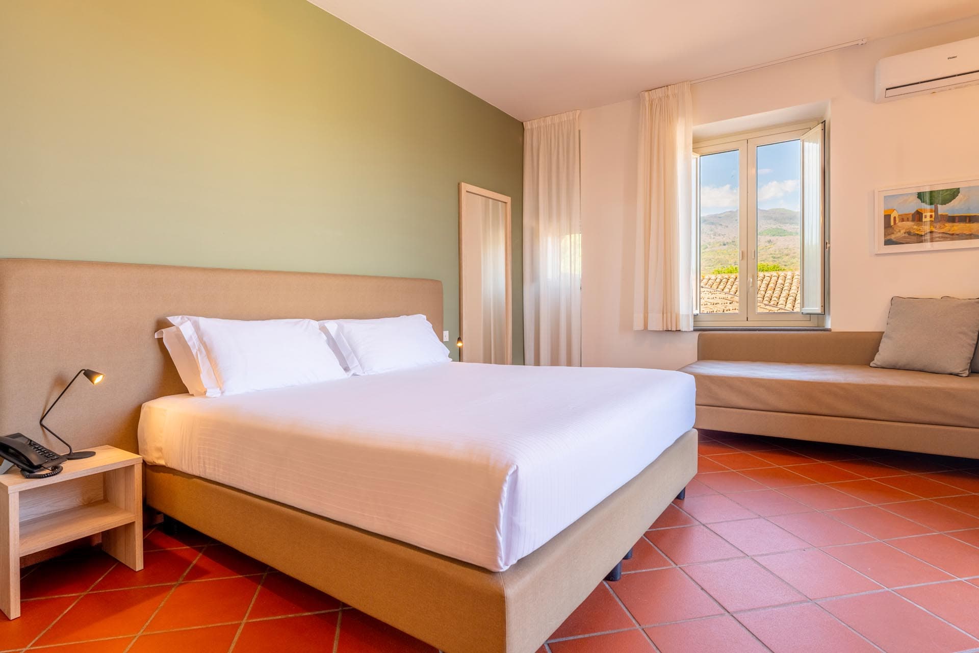Enjoy the stunning views of Mount Etna from your private balcony while staying in this elegantly furnished room. This room has a king-size bed. Wake up with a cup of tea or coffee and cosy up to watch a movie on the HD TV. This room has a walk-in shower with a rainfall showerhead in the bathroom.