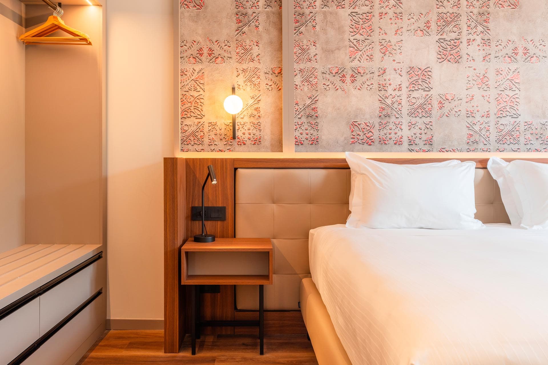 This elegant and spacious Deluxe room has twin beds. Start your day right with a cup of tea or coffee on your private balcony, or cosy up to watch a movie on the 55-inch HD TV. This room has a walk-in shower with a rainfall showerhead in the bathroom.